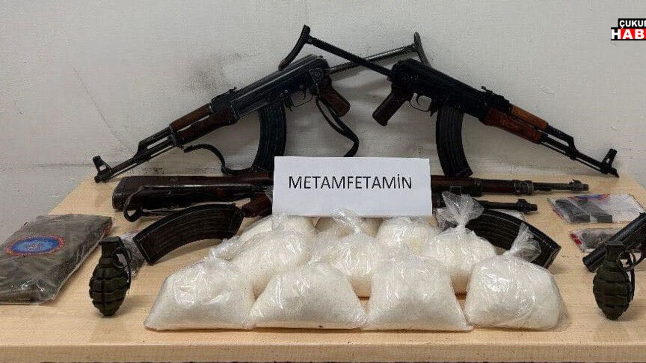 Yapılan aramalarda 5 bin gram metamfetamin, 3 adet AK-47 kalaşnikof piyade tüfeği, 1 adet mavzer tüfek, 2 adet el bombası, 1 adet tabanca, 19 adet şarjör, 424 adet fişek, 2 adet kütüklük ve 34 adet doldurma aparatı ele geçirildi.