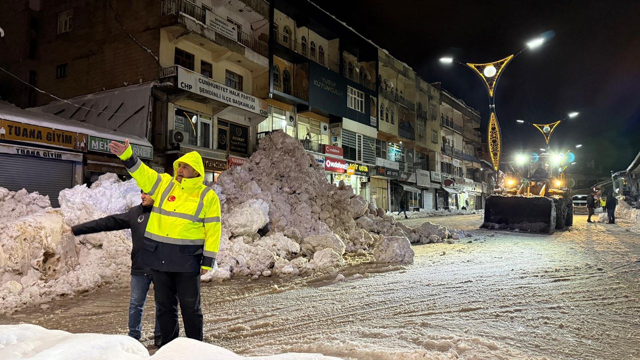 Yoğun kar yağışının ardından Şemdinli Belediyesi ekipleri, çarşı merkezinde gece boyunca kar temizleme çalışmalarını aralıksız sürdürdü. Belediye Başkanı Fahri ŞAKAR, sahaya inerek çalışmaları yerinde takip etti.