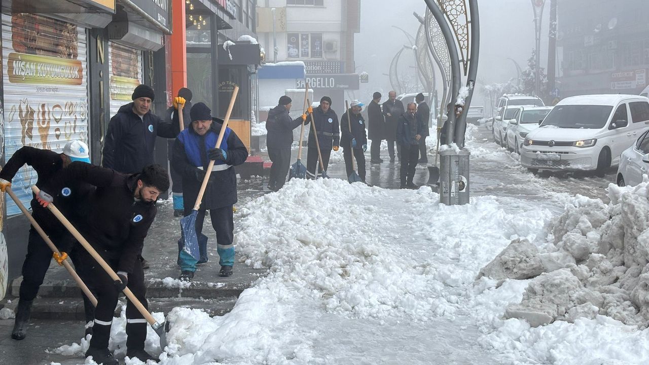 Karla mücadele ekiplerinin yol açma çalışmaları sürerken, belediye ekipleri de kent merkezinde kar temizleme çalışması başlattı. Ekiplerin, yaya güvenliğini sağlamak amacıyla kaldırımlarda yoğun mesai harcadığı belirtildi.
